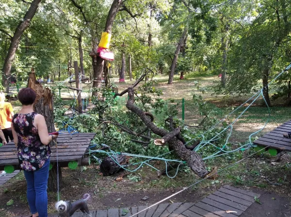 Очевидцы сообщили, что массивная ветка дерева упала прямо на натянутые тросы и деревянные платформы верёвочного парка.