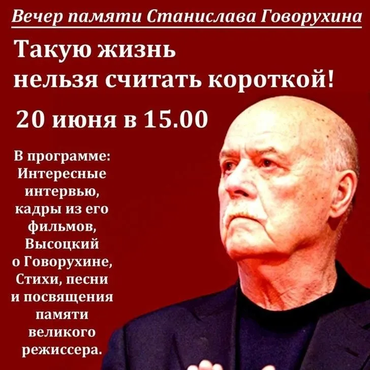 20 июня в Центре Высоцкого состоится вечер памяти народного артиста России, который ушел из жизни 14 июня в возрасте 82 лет. Дружба Говорухина с Высоцким началась с его первой картины "Вертикаль", для которой музыкант написал свои произведения. На мероприятии прозвучат воспоминания о Говорухине и фрагменты интервью, песни и стихи. Вход будет свободным.