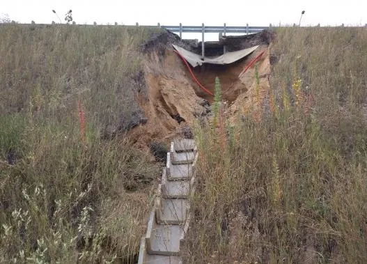 Напомним, на днях там подмыло телескопические водосборные лотки. Обвал края обнаружился на участке недалеко от железнодорожных путей.