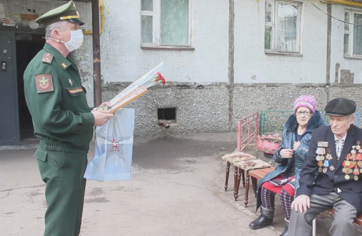 В годы войны он был командиром легендарного танка Т-34, награждён медалью "За отвагу". Ансамбль песни и танца Дома офицеров 2-й армии "Волжские казаки" исполнили для ветерана известные военные песни. Такой формат мини-концерта предполагал, что главный зритель будет смотреть его из окна своей квартиры, но 94-летний ветеран заявил, что он ещё не настолько стар, и вышел к подъезду со своей супругой.