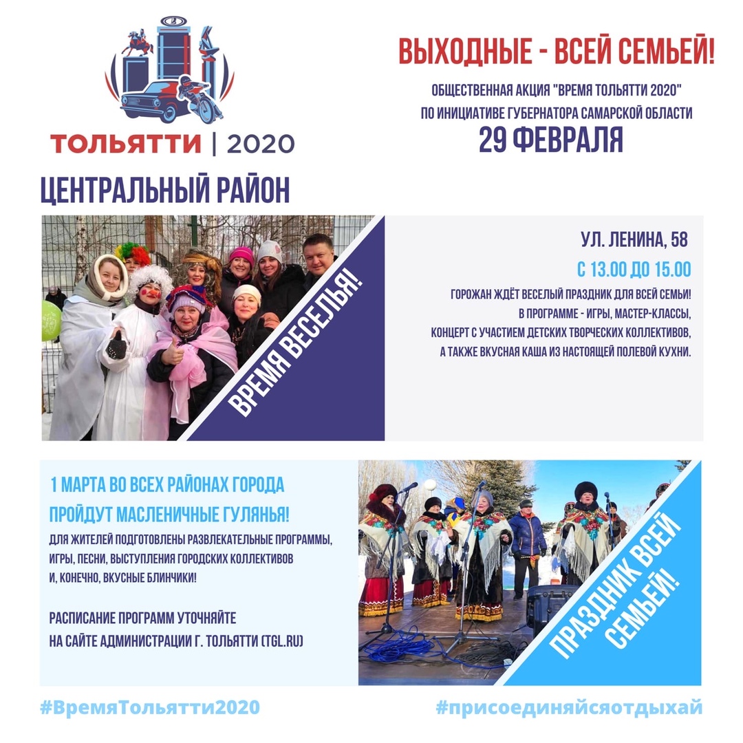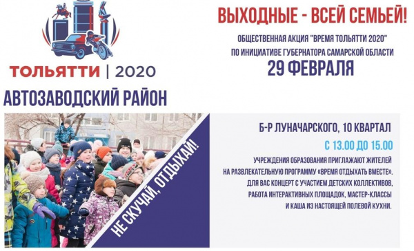 Напомним, что 1 февраля губернатор Самарской области Дмитрий Азаров объявил о старте проекта "Время Тольятти–2020". Он позволит тольяттинцам отметить значимые события вместе - всем городом. Организаторы запланировали множество мероприятий, в которых должны принять участие порядка 140 тысяч человек.