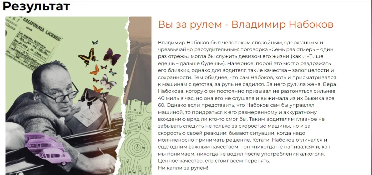 Также можно пройти тест, чтобы узнать, на какого поэта за рулем они похожи. Sovainfo.ru уже приняла участие и получила свой литературный результат. А кто вы за рулем?
