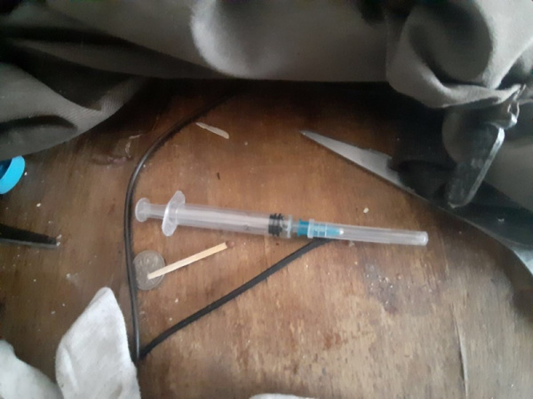 При осмотре жилища полицейские обнаружили стеклянные бутылки с ложками и одноразовые шприцы.