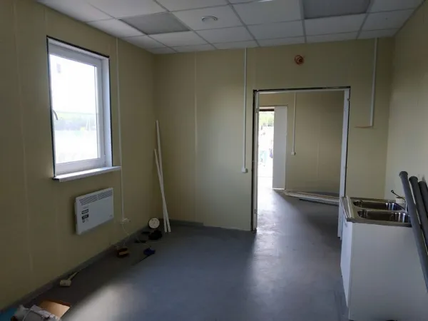 Работы по строительству идут с соблюдением сроков. Уже сегодня здание под крышей, утеплены и обшиты стены. Также возведены внутренние перегородки. Установлены двери, окна, раковины, душевые кабины и батареи.
