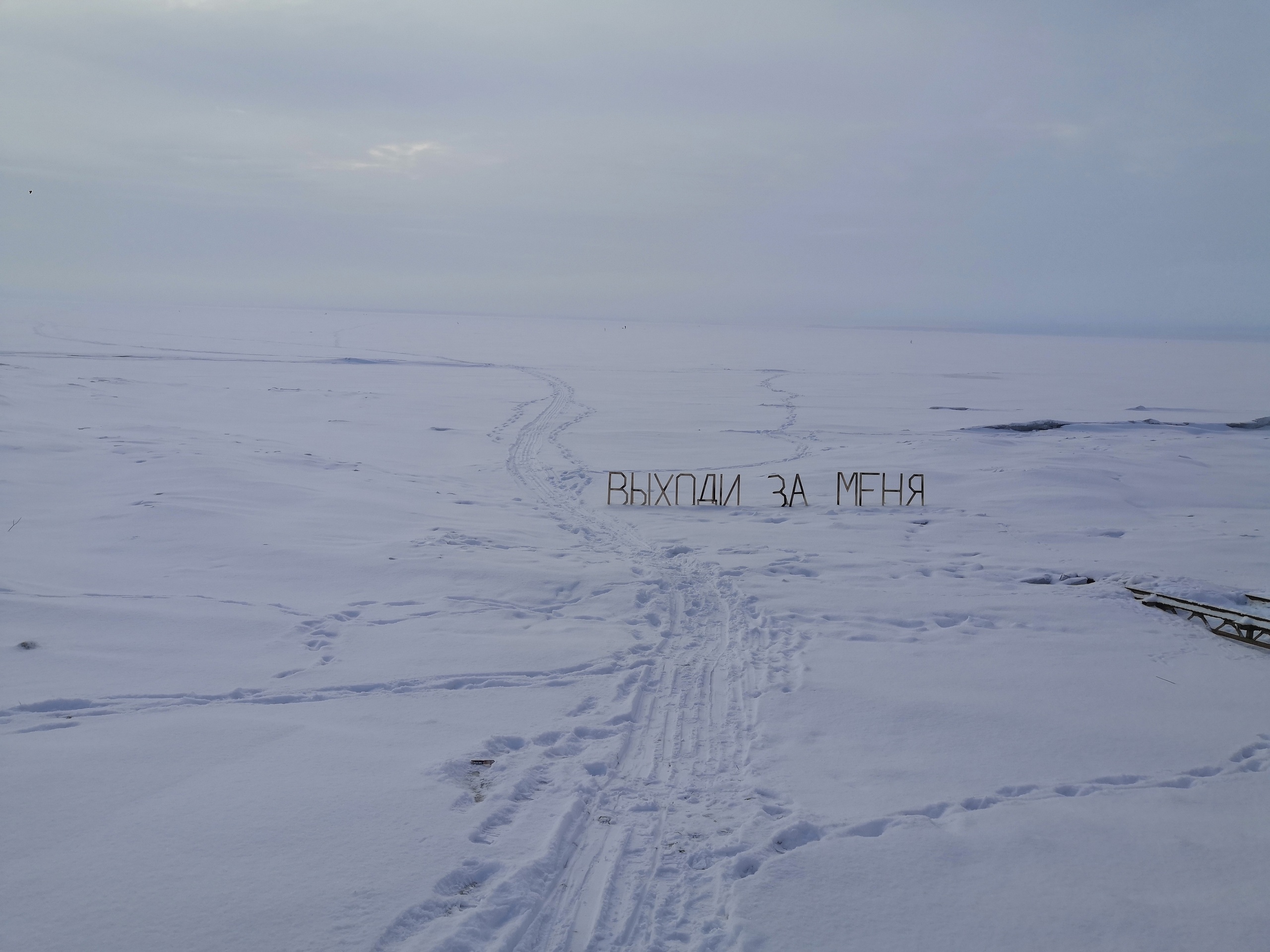 - Бывают романтичные любители зимней рыбалки! Гулял и увидел такой необычный объект – из деревянных палок выложены слова "Выходи за меня". Видимо, еще была и иллюминация – древесина немного обожжённая.